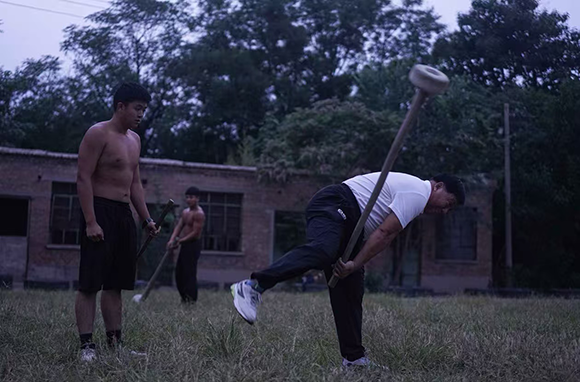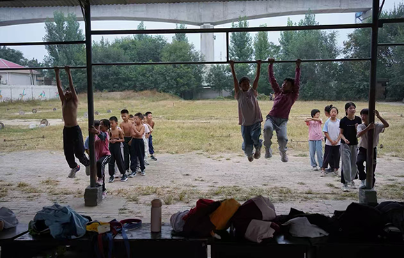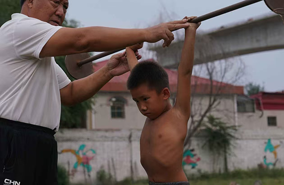 作为训练场使用的简陋铁皮房,冬天像冰窖,夏天如蒸笼。一年365天,除了春节三天,训练从不间断。孩子们放学就赶来,练到晚上8点才回家吃饭写作业;假期则从早晨7点直到晚上8点。清晨,他们相互背着跑圈,10圈起步;接着是举石锁、抡铁盘…….每组300个。雪地里的清晨,孩子们的热汗在头顶蒸腾出白雾,49摄氏度的盛夏午后,虫蚁在腿上留下密密麻麻的疤痕。