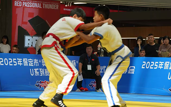 2025年保定奥运冠军之城杯中国式摔跤U系列比赛,在白鹤江的震慑下,直隶国术馆的孩子们与对手死死缠斗。