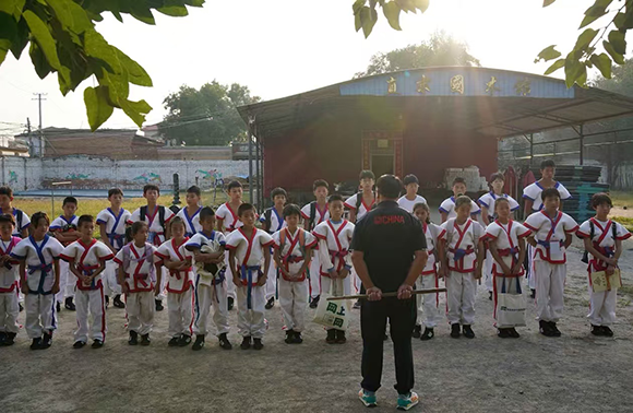 比赛开始前的清晨,太阳刚刚升起,国术馆的学员们已穿戴整齐,集中在训练场列队听白鹤江赛前训话。