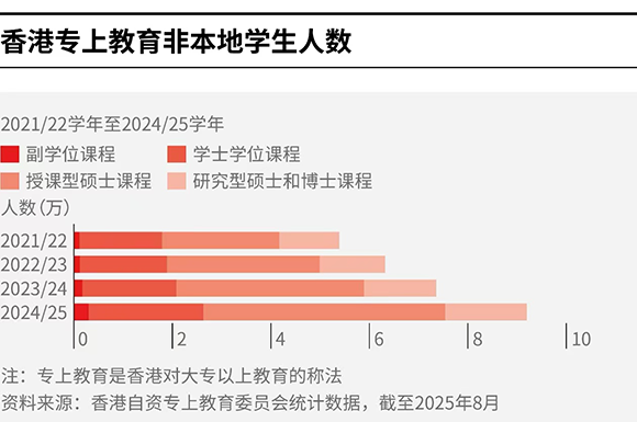 拥挤的校园背后,是香港日益庞大的非本地生群体。据特区政府下属的自资专上教育委员会数据,在香港修读学士以及研究生课程的非本地学生数量从2021/22学年的5.28万人增至2024/25学年的8.9万人,四年间增长近3.62万人,而香港修读专上(大专及以上教育)的学生一年总共大约有29万人。